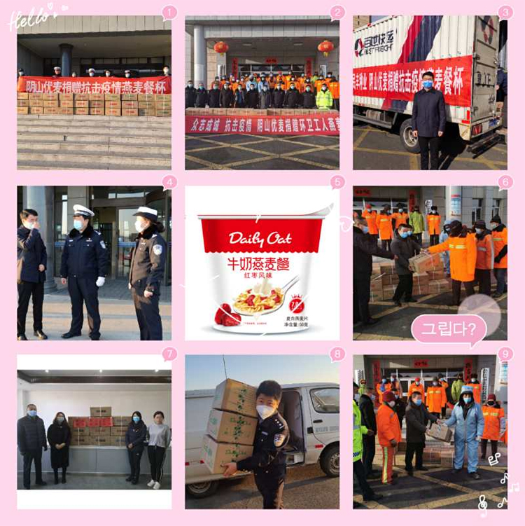 2月2日公司通過集寧區(qū)紅十字會(huì)捐贈(zèng)燕麥餐杯9000只,2月7日通過察右中旗紅十字會(huì)捐贈(zèng)燕麥餐杯 3300只,2月12日向抗擊在疫情一線的烏蘭察布市交警支隊(duì)捐贈(zèng)燕麥餐杯1500只,2月14為堅(jiān)守疫情防控一線的城管環(huán)衛(wèi)人員送上燕麥餐杯1650只,2月16日為集寧區(qū)橋東街道泉山北街社區(qū)一線工作人員送上燕麥餐杯300只。截止目前,公司已累計(jì)捐贈(zèng)燕麥餐杯15750只,為抗擊疫情一線的工作人員提供了健康、方便的營養(yǎng)支持!