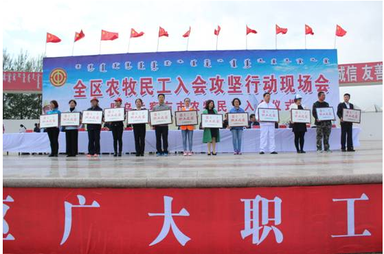 6月14日,全區(qū)農(nóng)牧民工入會(huì)攻堅(jiān)行動(dòng)現(xiàn)場(chǎng)會(huì)暨烏蘭察布市農(nóng)牧民工入會(huì)儀式在我市舉行。我公司組織30人的方隊(duì)參加了入會(huì)儀式。期間,自治區(qū)人大常委會(huì)副主任、總工會(huì)主席杭桂林,自治區(qū)總工會(huì)黨組書記、副主席崔明龍,自治區(qū)總工會(huì)副主席王麗紅,我市領(lǐng)導(dǎo)張琛、李建平、楊國(guó)文、王增強(qiáng)、王國(guó)相、于生龍,和各盟市工會(huì)分管主席、主管部門部長(zhǎng),各盟市黨委政府所在地的區(qū)(市、旗)總工會(huì)主席,各自治區(qū)產(chǎn)業(yè)工會(huì)負(fù)責(zé)人,自治區(qū)直屬機(jī)關(guān)工會(huì)工委負(fù)責(zé)人,區(qū)總相關(guān)部門負(fù)責(zé)人,市各旗縣市區(qū)工會(huì)負(fù)責(zé)人及部分市直基層工會(huì)負(fù)責(zé)人100余人來(lái)我公司進(jìn)行了實(shí)地觀摩考察。